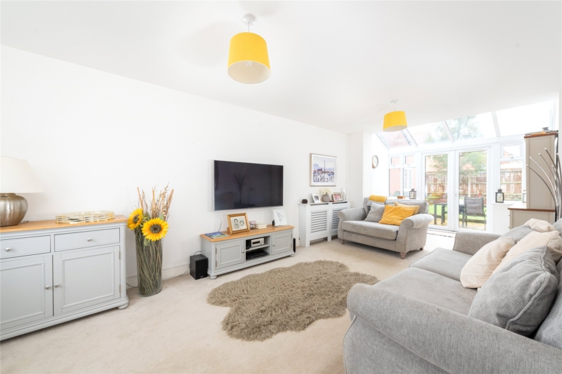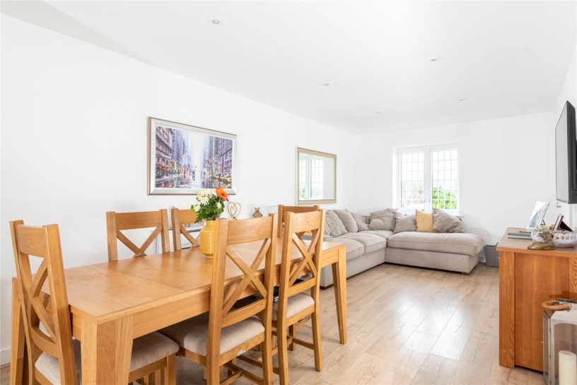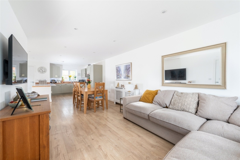 A particular feature of the property is the open plan kitchen/dining/family room which measures 32 ft. long. The kitchen is fitted in a range of modern units with complementary work surfaces incorporating a sink and a breakfast bar. Integrated appliances include a built-in double oven, a gas hob with an extractor over, a fridge/freezer, a dishwasher and a wine chiller. A door leads to the rear garden. The dining/family area has access to the understairs storage and a door to the sitting room.