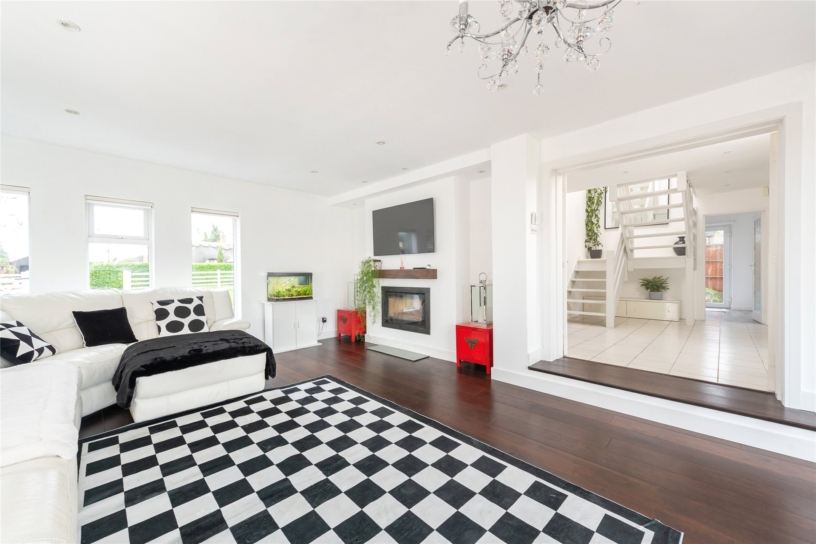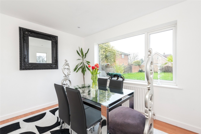 The property is set back from the road and has approximately1,844 sq. ft. of accommodation over two floors and the added potential to extend at the rear subject to planning permission. The entrance hall has a central staircase to the first floor, and provide access via double doors to both the sitting room and dining room. The triple aspect sitting room measures 24 ft. 3 by 15 ft. 10, and has a feature fireplace with a log burning stove, and a door to the rear garden. The study has a glazed door to the side. There is also a fitted kitchen, an adjoining utility room with a door to the side, and a cloakroom. The first floor landing has a hatch to the loft space and provides access to the four bedrooms and a family shower room. The principal bedroom has an en suite bathroom. The driveway provides parking and access to the double garage which has an up and over door, power, and light. The front is enclosed by timber fencing and has a lawned area and a decorative lamp post.