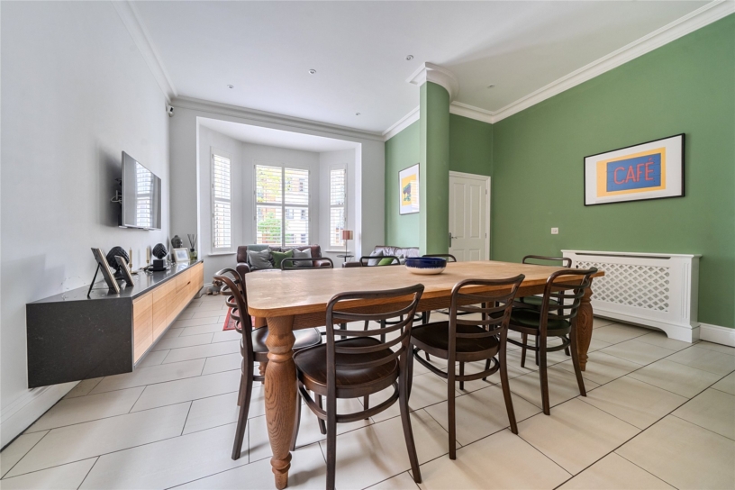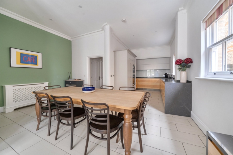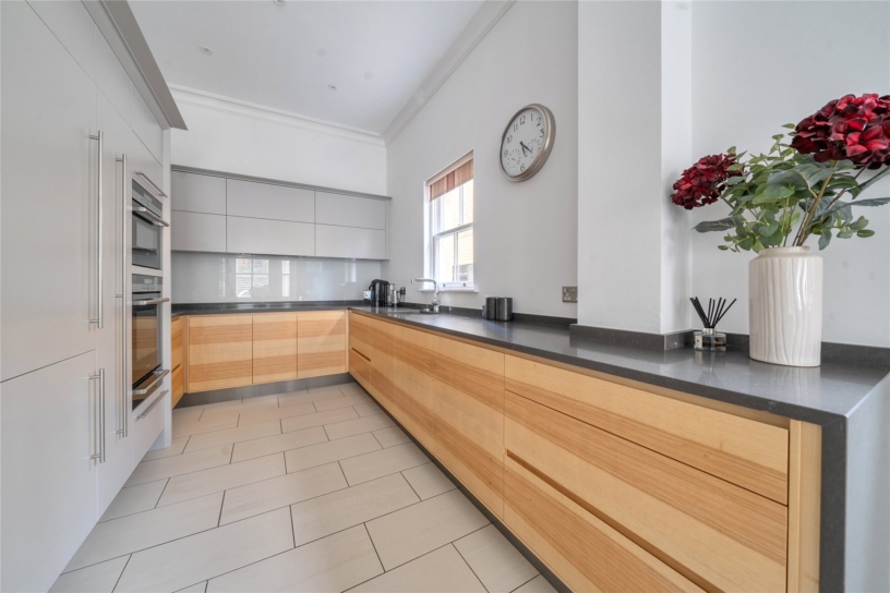 The kitchen area is fitted with a range of full height, wall and base units with quartz work surfaces. Integrated appliances include an electric oven, an induction hob, a warming drawer and microwave/combination oven, a fridge/freezer and a dishwasher. The dining/family area features a wall mounted media unit and a bay window to the front with made to measure wooden shutters.