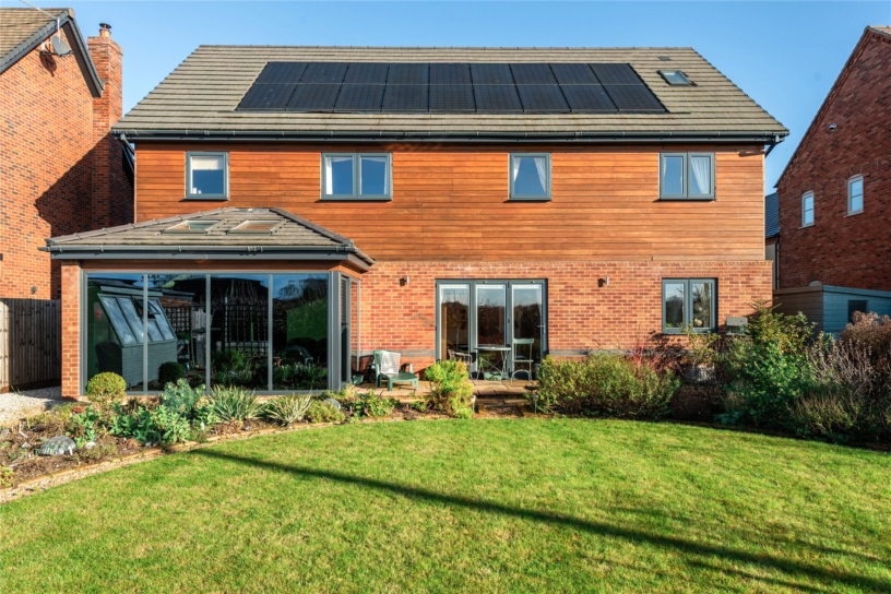 The property is finished to a high specification with an emphasis on energy efficiency and sustainability. The heating is provided by an Air Source heat pump and there is 6.1kw of solar panels with battery storage of up to 12kw. There is approximately 3,300 sq. ft. of versatile accommodation over three floors including four reception rooms, an open plan kitchen/breakfast room, a utility room, and two cloakrooms on the ground floor. The first floor has four double bedrooms, two with en suite facilities and there is a family bathroom. There is the possibility of two further bedrooms on the second floor, with four Velux skylight windows allowing plenty of natural light. This space could also be adapted for a variety of uses. The front has a gravel drive providing parking and access to a double garage with twin electric roller doors, power and light. With the attic space above it could be converted into an annexe subject to planning permission. Services run alongside.