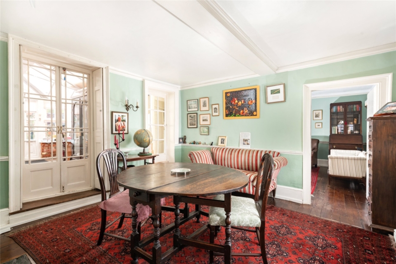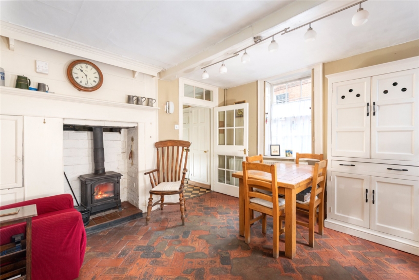 A solid timber entrance door leads into an original black and white tiled entrance hall, with paned glazed doors either side opening to the reception rooms. The dining room has a shuttered window to the front overlooking Church Street, a period style feature fireplace, exposed floorboards, dado rails, and doors to a conservatory with an exposed slate tiled floor and glazed doors to steps up to the garden. The sitting room has an original cast iron fireplace set in an Adam style surround, dado and picture rails, dual aspect shuttered windows, and exposed floorboards.
