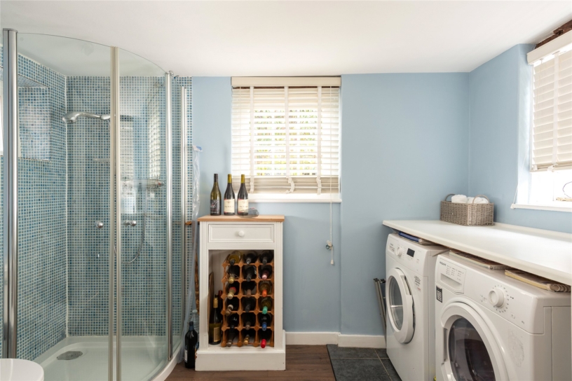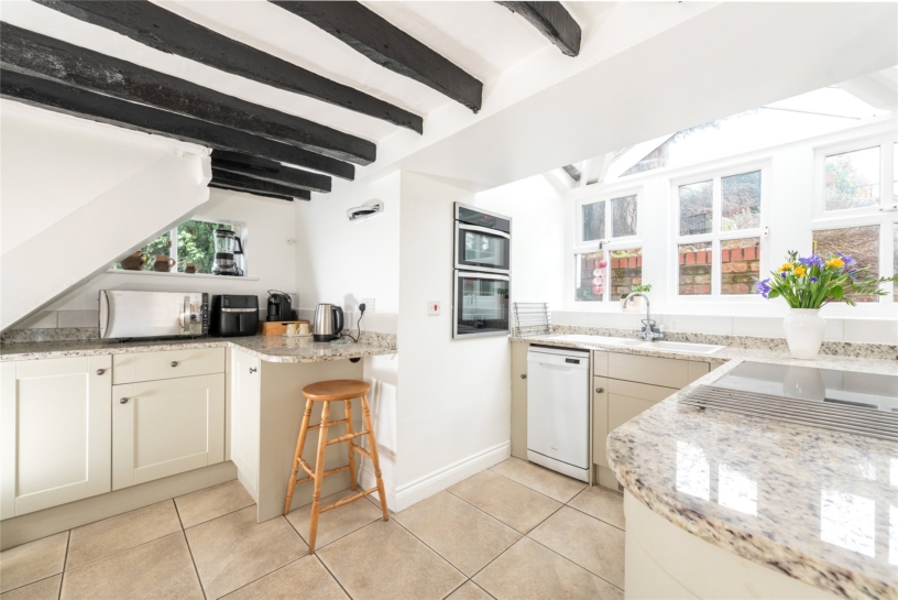 The morning room has dual aspect shuttered windows, custom built storage, and a dresser and bookcase (available via separate negotiation). Original features include a herringbone pattern brick floor, and a fireplace with a high mantel and a multi fuel stove. The kitchen has a tiled floor and splashbacks and a range of Shaker style units with granite and wood work surfaces incorporating a sink and breakfast bar. Integrated appliances include an electric double oven and induction hob and there is space and plumbing for other appliances. Triple aspect windows and a part glazed roof provide natural light and views over the garden and drive.