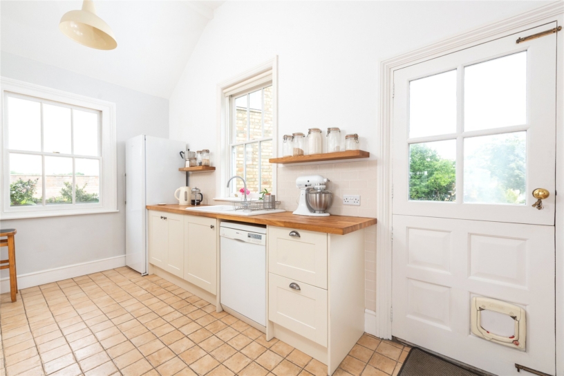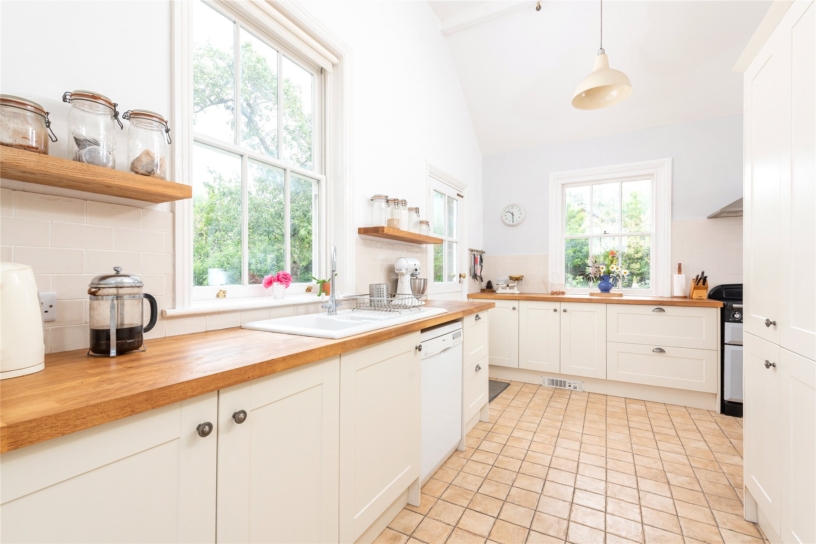 The open plan kitchen/dining/family room has original wooden flooring. The kitchen has been fitted with bespoke full height and base cabinets with wooden worksurfaces incorporating a one and a half bowl sink, a range cooker, fridge/freezer, and dishwasher. The adjoining dining/family room has a fireplace with a log burning stove. The triple aspect sitting room has French doors to the rear, original wooden flooring and a log burning stove. The third reception room has dual aspect window, and is currently used as a music and hobby room.