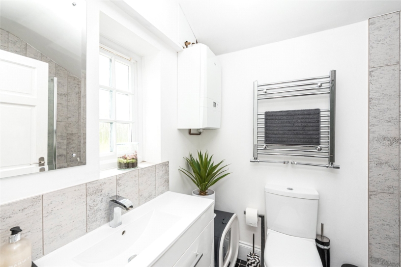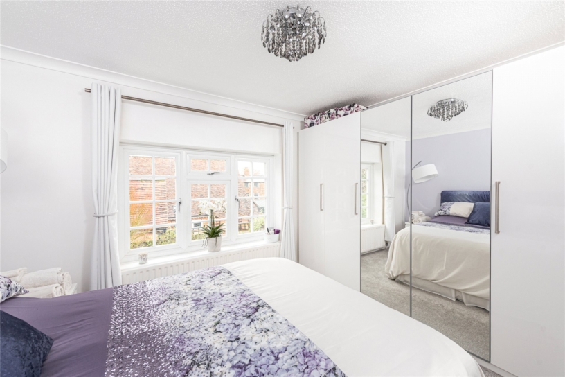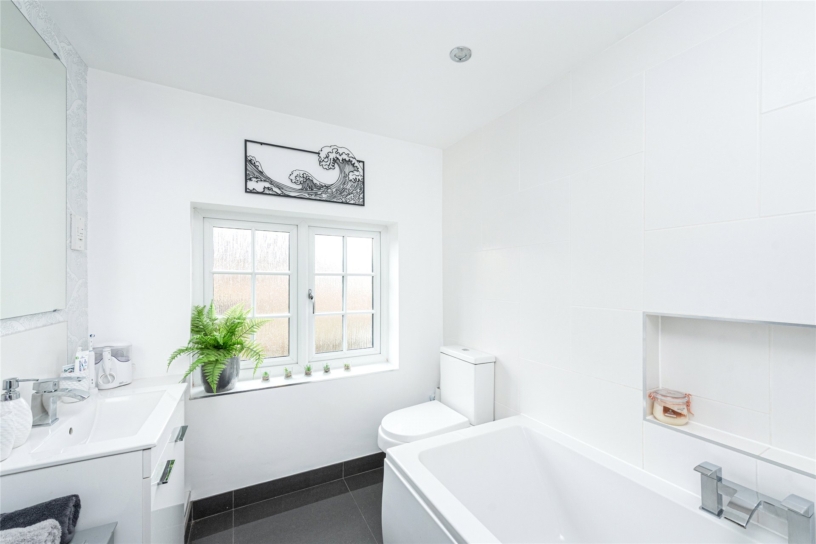 Accessed off the entrance hall, the refitted kitchen has a range of modern, contrasting, gloss fronted, wall and floor mounted units with Quartz worksurfaces and upstands. There are ceiling spotlights and Porcelain tiled flooring. Integrated appliances include a gas hob with an extractor over, twin electric ovens, a microwave, a dishwasher, and a fridge/freezer. There is a window over the inset sink which overlooks the front garden. The utility room, at the rear of the house, with a window over the patio, has fitted units with an inset sink.