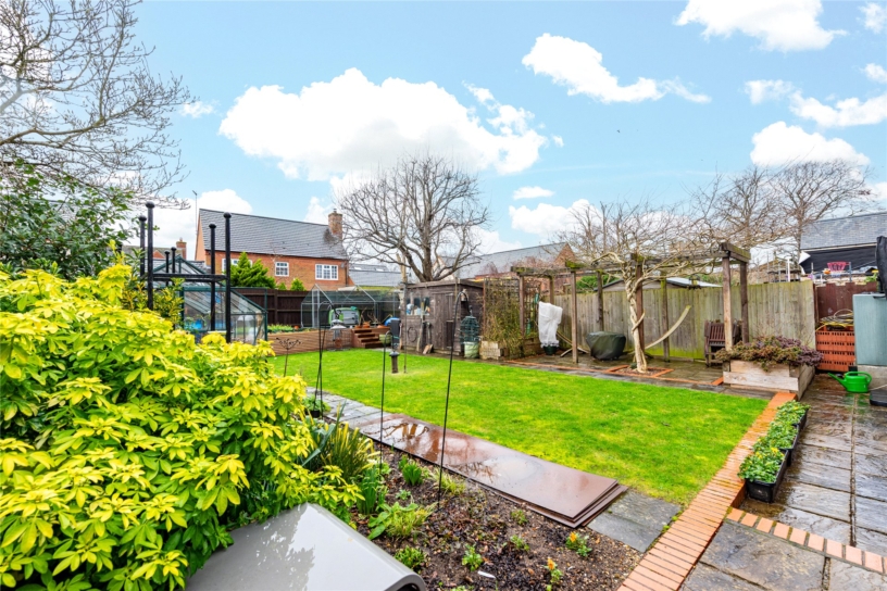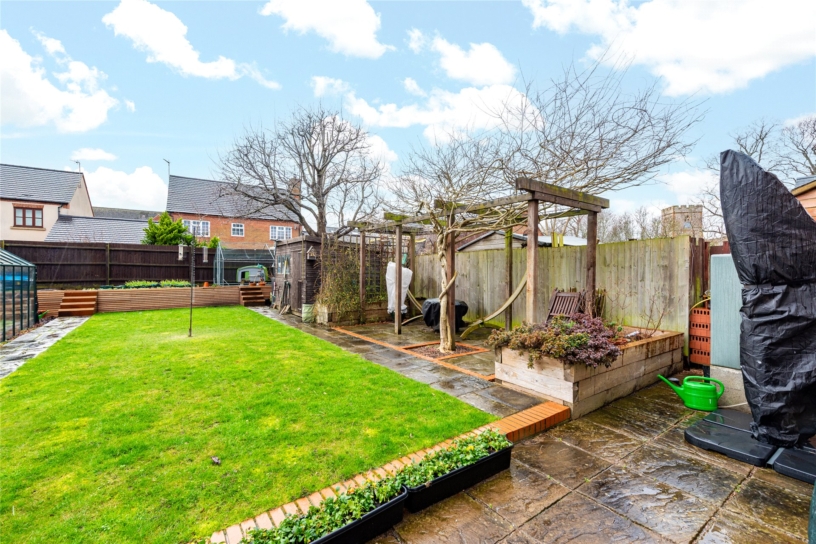 Accessed from gated side entrance at the front, and from doors in the family and sitting rooms and bedroom two, there is a patio which extends the width of the property. An area to the side is covered by a wooden pergola and a central lawn has pathways to each side with mature flower and shrub beds and borders. Towards the rear, there are steps up to a raised and planted area. The garden has fenced boundaries and a wooden shed.