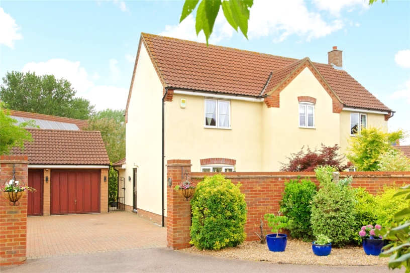 A modern detached house with gated driveway parking, a detached double garage, a detached home office and an enclosed landscaped rear garden in the Middleton area of Milton Keynes.