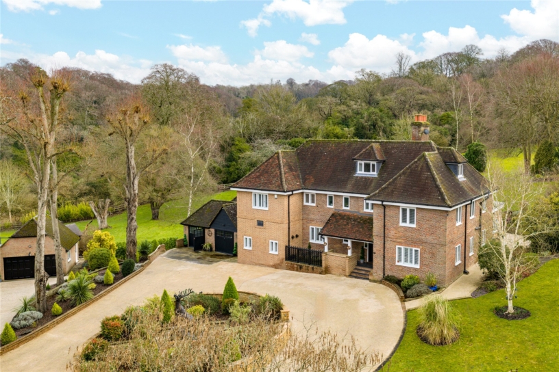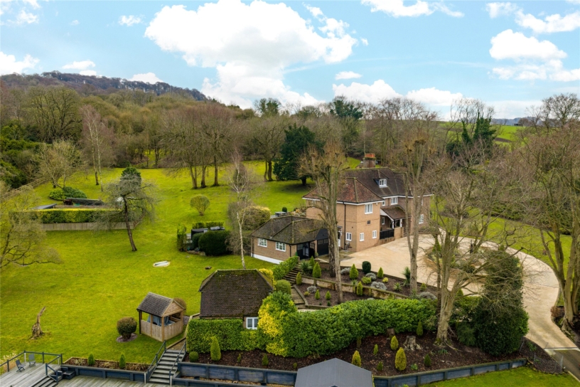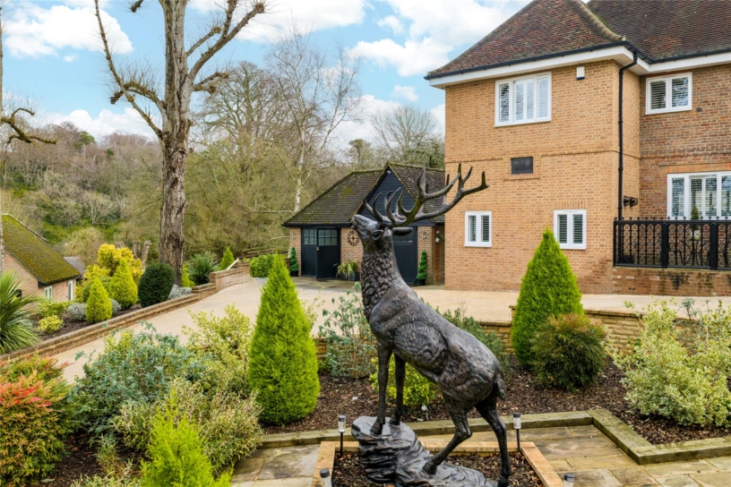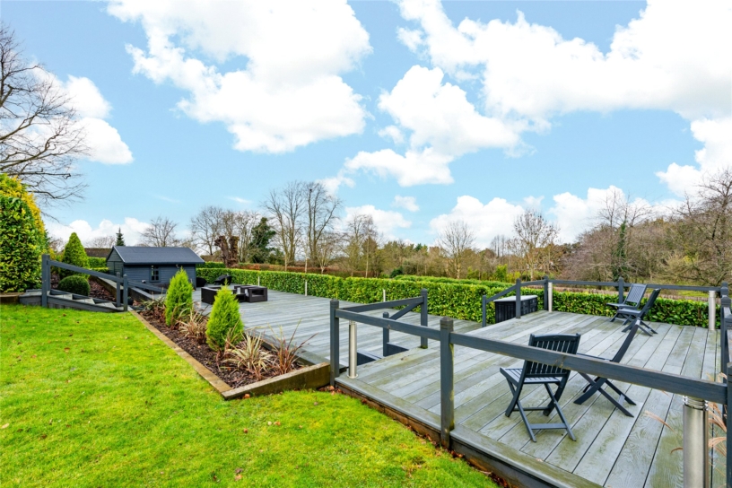 From the road. a tree-lined, and hedged tarmac driveway, with a paddock on one side, joins the circular resin bound driveway that passes the front of the house. The centre of the turning circle is planted with a variety of shrubs and has a feature statue of a stag. In a raised position, the house is surrounded by the sloping lawns of the secluded wraparound gardens which are professionally landscaped and include mature indigenous trees such as yew, walnut, and beech as well as specimen trees and established shrub - mahonia and bamboo for example - alongside clipped beech, box, and laurel hedging. At the rear of the house is a resin patio which is enclosed by a crescent of raised planted rockeries with central stone steps leading to the raised lawn. There are four separate composite decked seating areas, the largest already noted. The garden is enclosed by post and rail fencing with native trees and hedges and at the rear of the garden towards the south is the private indigenous woodland.