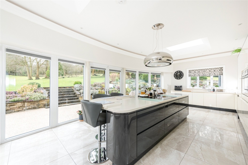 The over 30 ft. long Kitchen/breakfast/dining room leads off the hall via double doors accessing the dining area, with a window to the side and a walkthrough to the breakfast area. The entire open plan space has oversize marble effect porcelain floor tiles and underfloor heating in the kitchen and dining room. The triple aspect, air-conditioned kitchen/breakfast area was remodelled in 2018 and includes a convex bank of windows overlooking the garden with central French doors opening to the patio. There are two lantern skylights and windows in the side walls. A range of base and wall gloss fronted modern units has Corian worksurfaces and an integrated double sink. The central island with a curved profile has contrasting base storage units (including pan drawers), a breakfast bar seating four, and an inset induction hob in the matching Corian worksurface. Integrated AEG appliances include two ovens, a microwave, a heated drawer, separate full-size fridge and freezer, and a dishwasher.