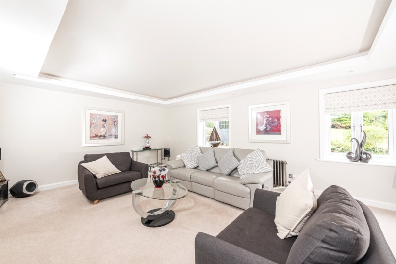 Measuring over 20 ft. by over 15 ft., the sitting room has windows with roman blinds overlooking the sloping lawns of the side garden. There is a media wall with 58 in. Bang & Olufsen TV screen with a long-line modern flame-effect fire behind a glass window below.