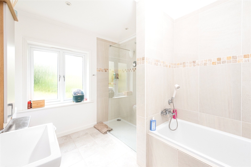 Bedroom three has built in wardrobes and a window with views over the rear garden and beyond. The fully tiled en suite shower room has underfloor heating and an obscured window to the rear, with a matching WC, a basin in a vanity unit and a walk-in shower with a glass screen.