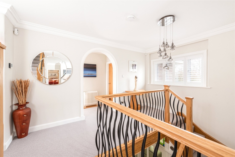 The galleried L-shaped first floor landing has a window overlooking the front drive with plantation shutters and storage cupboards. There is a typical 1930s arch accessing two of the bedrooms and doors lead directly off the landing to the two additional bedrooms and the family bathroom. A further staircase in the same style leads to the galleried second floor bedroom with a storage cupboard into the eaves accessible via a door over the stairs.