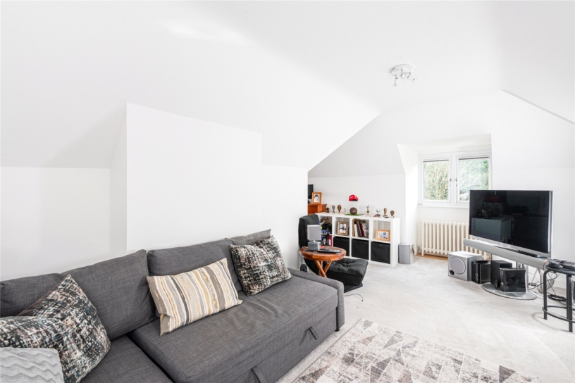Dual aspect bedroom two, once the principal bedroom, is over 14 ft. square and has built-in wardrobes and windows overlooking the side and rear. The four piece en suite bathroom has partially tiled walls behind the walk-in double shower and the panelled bath, and a tiled floor with underfloor heating. The vanity unit supporting the hand basin has drawers below and cupboards above with an automatic mirror light. There is an obscured window over the side.