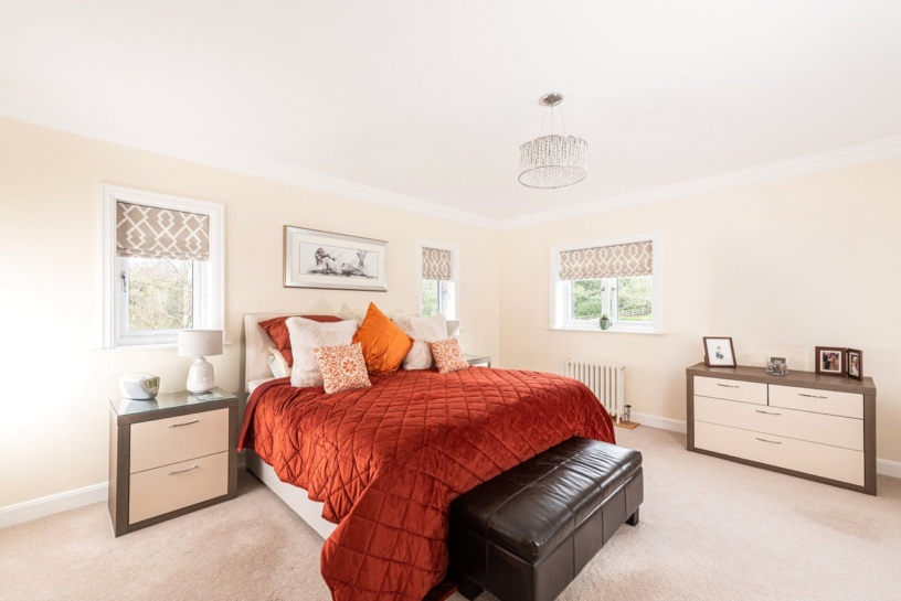 The principal bedroom measures over 19 ft. by nearly 16 ft. and has double windows in the south and east walls with views over the gardens. The room has Strachan bedroom furniture, including two bedside tables, two chests of drawers and a dressing table. A door opens to the dressing room with a window overlooking the front, which has four matching double-doored wardrobes and a further cupboard with drawers beneath. A further door in the bedroom opens to the en suite bathroom which has underfloor heating beneath marble effect floor tiles and similar but contrasting tiles on three of the walls. A window with plantation shutters overlooks the drive above a stand-alone contemporary roll-top bath with free-standing taps at one end. There is a walk-in double shower with a glass screen and a double basin set in the tempered glass surface of a vanity unit with wooden storage beneath, cupboards above, and an automated mirror light. The room has three contemporary heated towel rails.