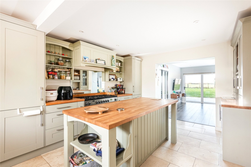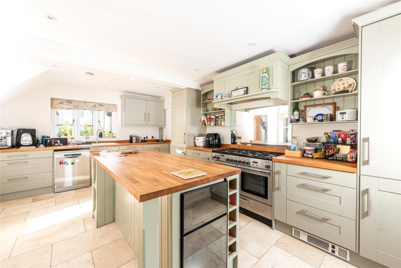 The kitchen area is fitted with a range of painted Shaker style units and a dresser with beech wood worktops and an inset ceramic sink; there is stone tiled flooring. A Rangemaster cooker has a six-burner gas hob with an extractor above and there is an integrated fridge/freezer. The central breakfast island seats two and has shelving and space for an integrated wine fridge and there is also space for a dishwasher. Leading off the kitchen/breakfast room is a utility room which has a sink and space and plumbing for a washing machine and tumble dryer.