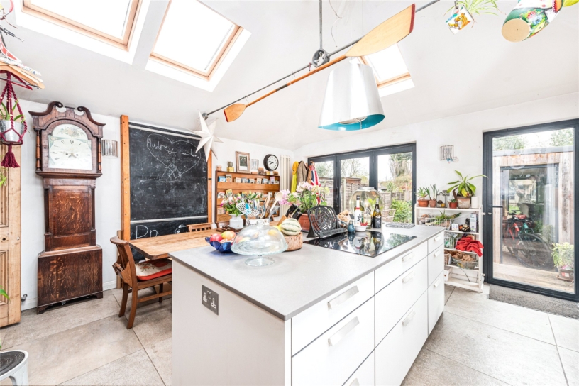The property was extended about 10 years ago to create a kitchen/dining room with five Velux windows, bi-folds, and French doors allowing ingress of natural light. The tiled floor has underfloor heating and the kitchen has modern, gloss units and an island with an induction hob and an Italian designed extractor above. There are an integrated double oven and space for a dishwasher and fridge/freezer as well as room for a dining table. An adjacent walk-through accesses a pantry/utility area with space for a washing machine and tumble dryer, a Worcester boiler (serviced in January 2026), shelving, and a butler’s sink.