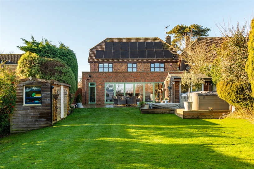 There is gated access to the rear garden which has a patio spanning the width of the property and a decked area with a swim spa (which is available subject to separate negotiation). Adjacent to this is a home office which has power and lighting. At the bottom of the garden there is a second decked area with seating, a bar area, and a 'sleepover' treehouse with a bunk bed. On the right side of the garden is a garden shed. There is open countryside beyond the garden with views from the first floor.
