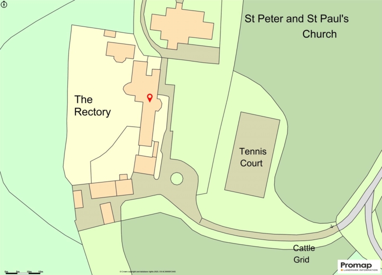 The village road with a cattle grid leads to double, electrically operated metal gates which open to the drive approaching the property. This widens to become a carriage driveway with a circular, planted central bed, creating a turning circle opposite the coach house and garage. A path leads to a paved area with a deep, established herbaceous border with clipped box immediately in front of the house, overlooking the front lawn. The paving reaches the front door and continues to a gate accessing the church with a boundary of trees. Beyond the front lawn is the tennis court.