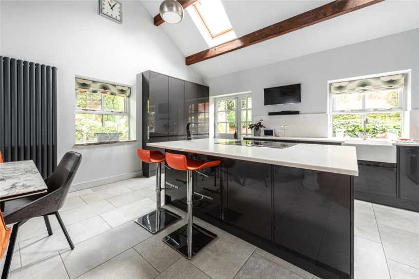 Accessed from the entrance hall, the dual-aspect kitchen/breakfast room is fitted with a contemporary range of gloss-fronted wall and base units with contrasting work surfaces, and an inset butlers’ sink with a boiling water tap. A central island incorporates an induction hob, range ovens and breakfast bar seating. The vaulted ceiling features exposed beams and Velux rooflights, and further natural light is provided by dual aspect windows and a glazed external door.