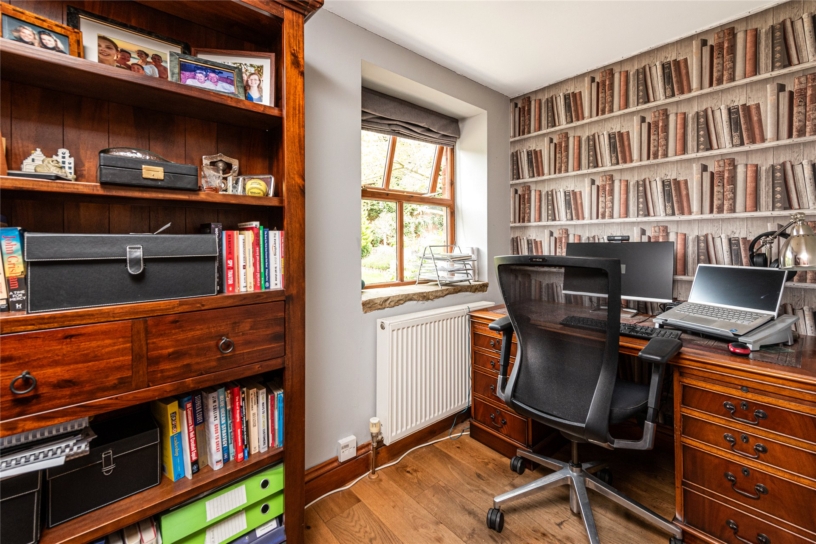 The ground floor is centred around a striking double-height entrance hall. The triple-aspect sitting room has exposed ceiling beams and a brick fireplace with log burner, creating a focal point, while a formal dining area and separate study provide flexible spaces for entertaining and home working. The contemporary kitchen/breakfast room forms the heart of the house, complemented by a utility room for day-to-day functionality. Two double bedrooms, a four-piece family bathroom and a guest cloakroom complete the ground-floor accommodation, making this level particularly adaptable for multi-generational living or guests. Upstairs, the principal bedroom provides an airy private retreat and has an en suite bathroom and a dressing area with fitted wardrobes. The first floor also has two further bedrooms and a modern family bathroom.