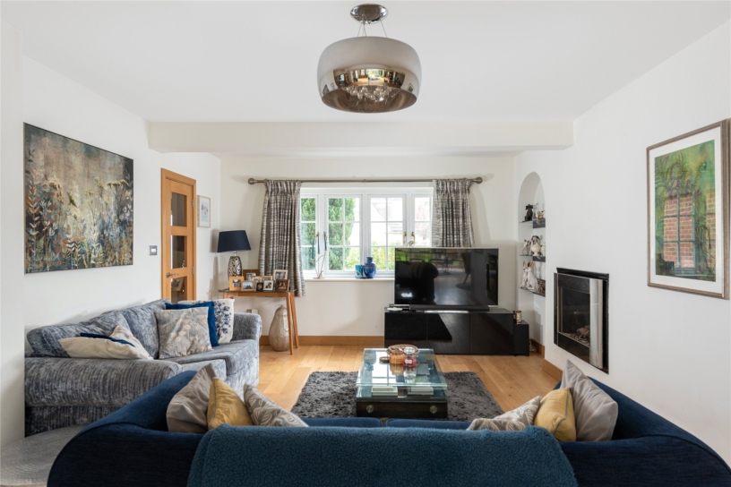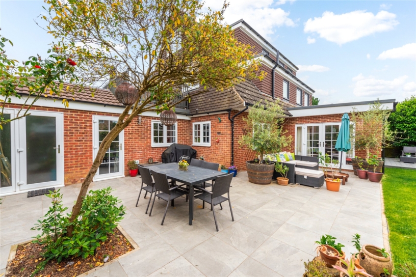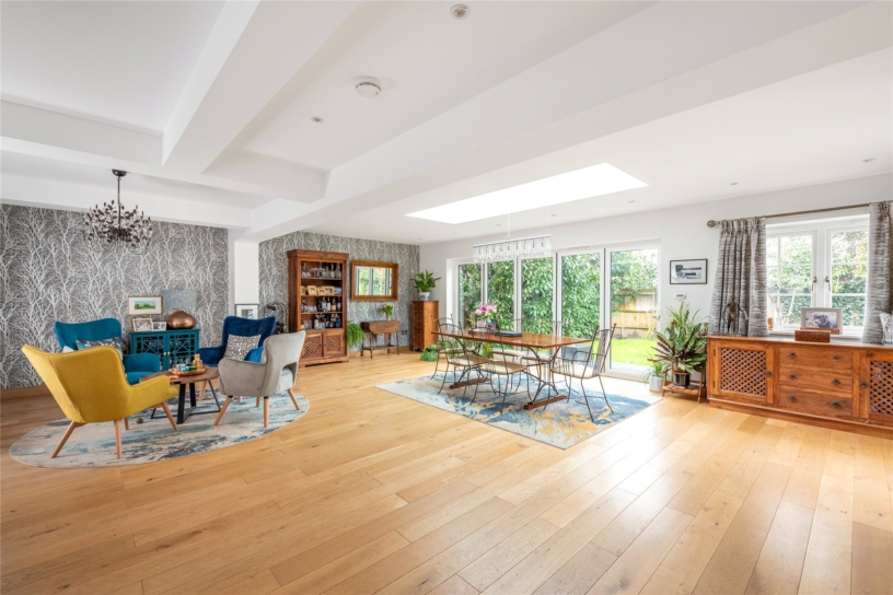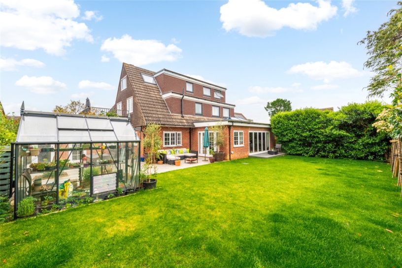 The current owners have lived in this property for two decades and have stressed the sociability of daily family life in a cul-de-sac comprising comparable houses. 2 Knottocks End is within walking distance of Beaconsfield town centre, with its many restaurants and shops, and minutes away, via a ‘green alley’ from a network of footpaths through long-established public woodlands and open fields. The house, built in 1968, was designed as a family home and has been extensively updated three years ago to accommodate the versatility required by a contemporary lifestyle, with an open plan living area downstairs, a gym, and a study or home office. While convenient in terms of local amenities and transport, the enclosed rear garden feels private and the treetops of the nearby woodland can be seen from the house and garden.