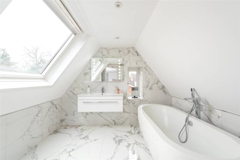 A door opens from the first floor landing to an enclosed staircase that rises to the new fourth bedroom, at the top there is an area of galleried landing in the room with a glazed balustrade and a carved newel post. This bedroom, running the length of the second floor, like bedroom three, has new Everest double glazed windows, in this case three, overlooking the rear garden. At the furthest end of the room is a walk-in dressing room with hanging rails and shelving. On the right of the stairs, a door opens to the en suite bathroom, with a window in the gable end and a Velux above, which is has marble tiles on the floor and walls. There is a single shower, a modern stand-alone bath with central taps and a hand-held shower, a wall- hung vanity unit with a double length basin and a WC. Over recent years, not just the rear bedrooms, but the entire house has been refitted with Everest double glazed windows, including the bifold in the recently refurbished living areas.