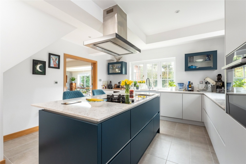 In the smaller, seating area of the sitting/dining room there is a window overlooking the front and a door to the entrance hall. To the left of the feature fireplace is an arched alcove with glass display shelves. This seating area is open plan with the sitting/dining area, which opens out to a width of almost 27 ft. and has a rectangular aluminium lantern over the current position of the dining table. Beyond the lantern, bifold doors open to a purpose-built area of decking set in the rear lawn. On the right and at a right angle, French doors with flanking windows open to the side terrace. Glazed, double doors open to the kitchen/ breakfast room. By the kitchen and study doors are two contemporary vertical radiators that resemble understated modern sculptures.