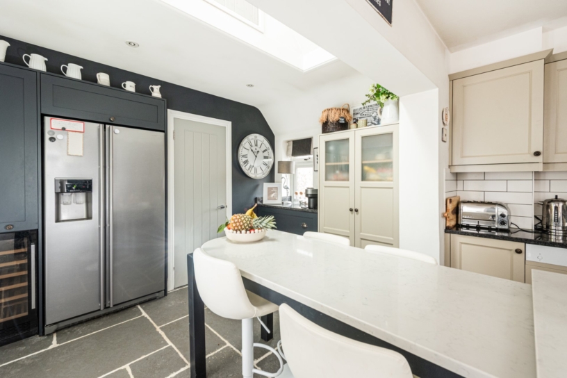 The front door opens to an entrance hall with doors leading to the kitchen, the ground floor bedroom, and the cloakroom. The hall flows into an open plan sitting/dining room, also open plan to the kitchen. Bi-folding doors open to the rear garden and the dining area has a pitched roof with sky light windows. The kitchen has central preparation and breakfast islands, stone work surfaces, a Belfast sink, and integral appliances. The ground floor bedroom has a dressing room and a four piece en suite bathroom.
