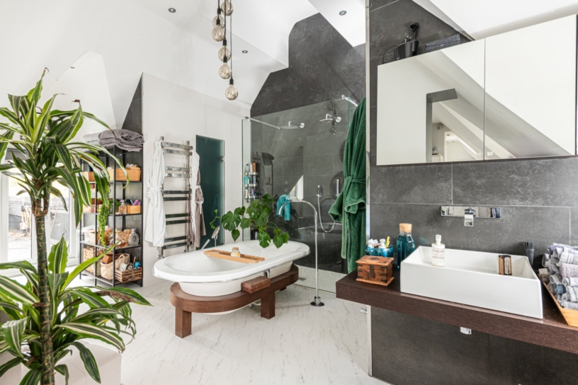 A walk through in the principal suite passes a dressing room with dormer windows and built-in wardrobes and storage. (The door remains, so this room could be restored as a bedroom.) The bedroom is over 32 ft. long, with a vaulted ceiling and a wooden floor. There are three matching pairs of dormers on each side, on one side overlooking the paved terraced garden below and on the other side two of the three dormers contain French doors opening to the raised terrace. This 27 ft. by over 20 ft. private decked terrace has far reaching views, wooden balustrading, and a built-in hot tub. One bedroom wall is lined with floor-to-ceiling wardrobes and at the opposite end of the room a screen, partially encloses the en suite bathroom. This has a central stand-alone modern roll top bath and a glass screened, tiled double shower with two shower heads. Doors open on each side to a WC and a fully tiled steam room. Beneath a window are two modern hanging wash basins with mirrored cupboards above.