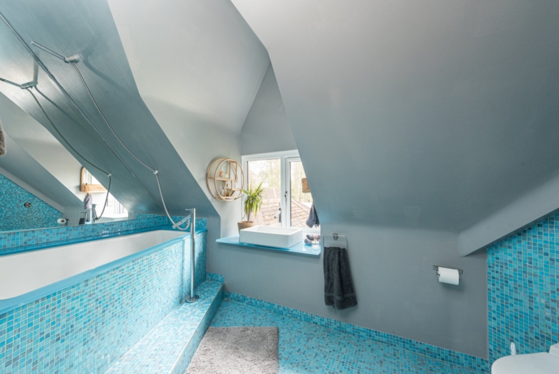 Bedroom two is accessed directly off the landing, like bedroom two it is vaulted and has a wooden floor. It has one dormer window overlooking the grounds and a window in the gable end overlooking the drive. There are built-in wardrobes. This room uses the next-door family bathroom which has a modern basin on the deep sill of the dormer window, a panelled bath with an overhead shower and a WC placed in the corner of the room. Some of the walls, the floor, the step up to the bath and the side of the bath have mosaic tiles.