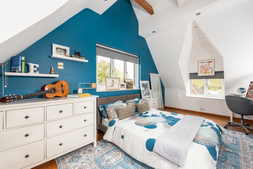 At the top of the staircase, a door in the landing opens to a separate space with a walk through to bedroom two and a door to the en suite shower room. Triple aspect bedroom two is 23 ft. long and has dormer windows at each end of the room and a window overlooking the drive. It is a vaulted room with a wooden floor. The en suite shower room has a basin in the dormer window, a walk-in shower, and a WC.