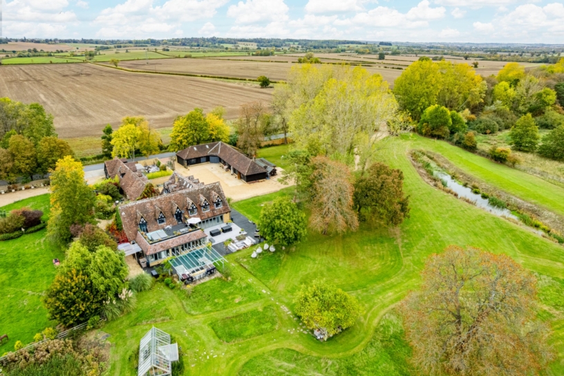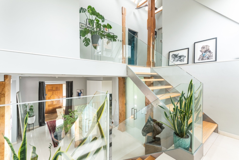 The entire ground floor has underfloor heating beneath Italian limestone or black tiled flooring; the flow of the accommodation is facilitated by the design of the hall. This over 18 ft. by over 25 ft. space contains the contemporary steel and wood open staircase with glass balustrades and has a bank of windows at the turn of the stairs illuminating the hall and first floor landing. In keeping with the staircase, glass double doors open to the reception rooms, the modernity of which is accentuated by flanking oak beams – these exposed timbers articulate space throughout the house. Also leading off the hall are a conveniently sited dual aspect boot room with a sink and a two piece cloakroom.