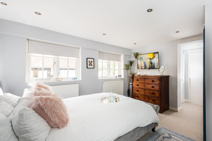 The brick semi-detached three bedroom cottage is a self-contained annexe facing onto the drive with an enclosed, rear paved garden. It is accessed via a stable door beneath a gabled bracket porch and there are three first floor dormer windows in the tiled roof. The approximately 847 sq. ft. of accommodation includes a dual aspect kitchen/dining/sitting room with a wooden floor and a staircase to the first-floor landing, and ample room for relaxed seating and a dining table. The fitted kitchen area has integrated appliances, metro tiled splashbacks, and French doors to the rear paved garden.