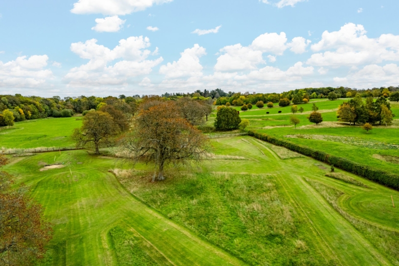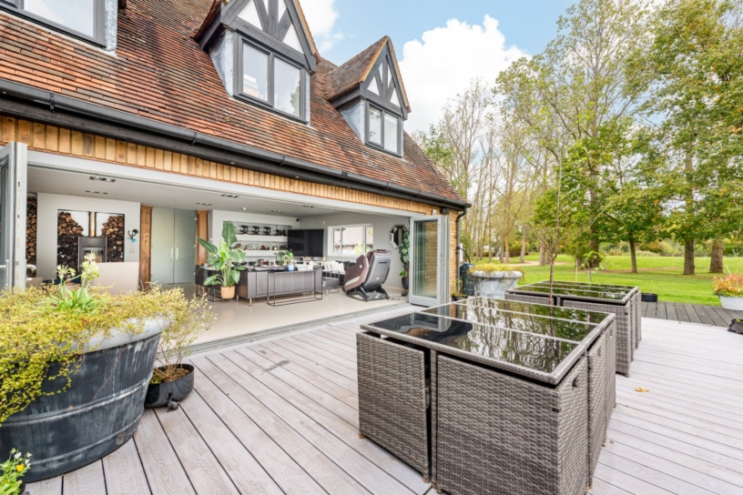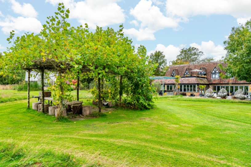 The majority of the four acres of grounds is parkland garden, scattered with mature specimen trees and bordered by clipped indigenous hedging, a variety of fencing and mature trees, bordering countryside. This established parkland, overlooked by the main reception areas of the house and the principal bedroom, features a nine-hole golf course and has areas of lawn and meadow, into which pathways are cut. On the south side of the house is a stone paved terrace garden accessible from the dining area, the guest bedroom, and the study. On two other sides, accessed directly by the kitchen/breakfast room French windows and the sitting area bi-folds, are terraces on different levels. These decking terraces, either wood or composite, include built-in seating areas, one with a pergola over, and continue as far as the entrance. There is a further stone paved seating area set in the lawn, with a pergola above.