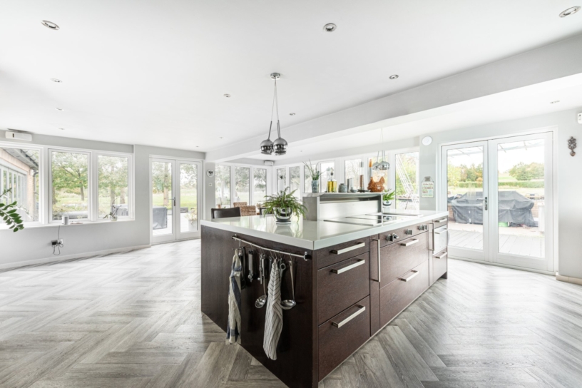 Accessed via double glass doors from the sitting/dining room, the nearly 23 ft. by over 19 ft. kitchen/breakfast room with Karndean herringbone flooring, has banks of windows on two walls with two sets of French doors opening to the decking terraces. There is ample room for an informal breakfast table overlooking the grounds and numerous USB points. The bespoke kitchen has a range of modern base and wall soft-close units, some glazed, with ceramic worksurfaces and an inset ceramic sink. The matching island unit has an inset induction hob with an extractor over and a breakfast bar with seating for four. Integrated appliances are Gaggenau, Miele, Siemens, or Bosch and include a conventional and steamer ovens, two warming drawers, a wine fridge, a dishwasher, and a full-height fridge/freezer.