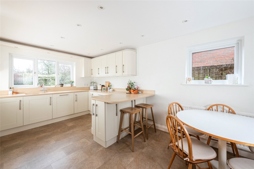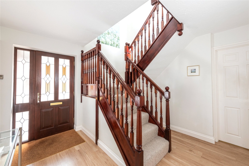 This brick under tile property has approximately 2,231 sq. ft. of accommodation arranged over two floors and including, on the ground floor, an open entrance hall with the wooden staircase which has turned balusters and understairs storage, and the cloakroom. Doors open from the hall to the three separate reception rooms: the sitting room, dining room, the study, and cloakroom. Another door accesses the dual aspect kitchen/breakfast room, which also leads to the utility room which has built-in units with an inset sink and a window to the side, and a door to outside. Leading off the first floor landing are five double bedrooms, a four piece family shower room and a four piece en suite bathroom to bedroom one. The property is at the end of a no-through road. At the front there is a driveway leading to the double garage with an area of lawn and the rear lawned garden has views over neighbouring paddock land with the recreation ground beyond.