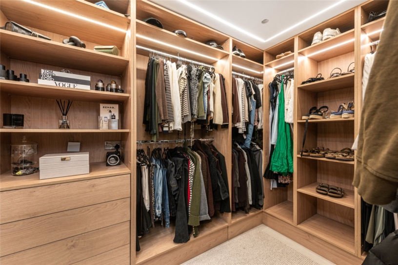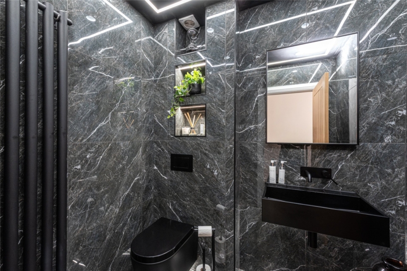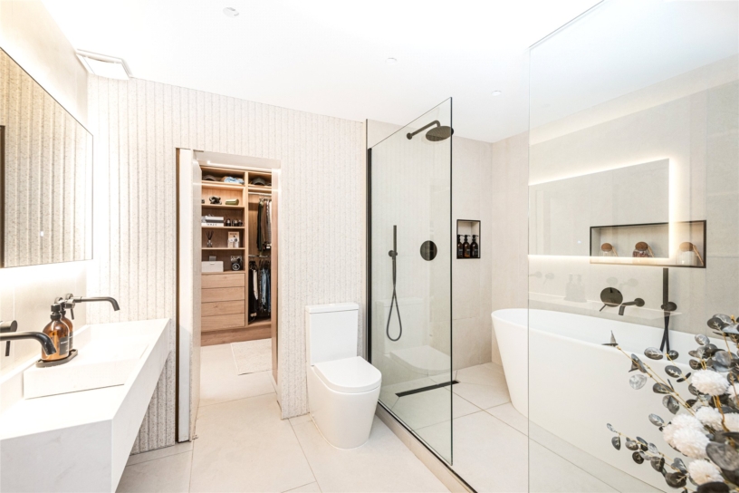 The lower level has three double bedrooms, the smallest measuring over 11 ft. by nearly 10 ft., all of which have built-in wardrobes, the principal bedroom two. Bedroom two has a French door to the rear courtyard. A particular feature is the contemporary family bathroom which comprises: two showers, a stand-alone bath (all behind glass screens), twin basins, and a low-level WC. A discreet door opens to a hidden dressing room, fitted with hanging rails, shelves and drawers.