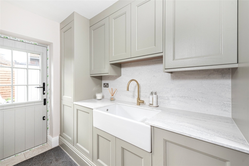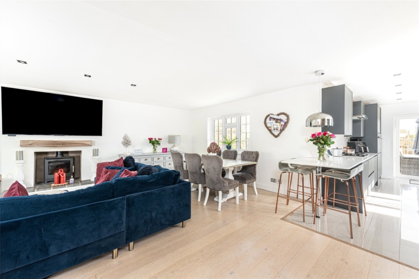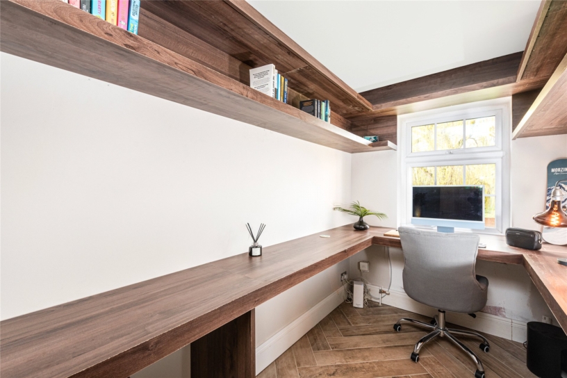 The upper level, the ground floor, includes a sitting/dining area measuring nearly 23 ft. by over 14 ft. leading into an over 17 ft. long newly fitted kitchen/breakfast room. This triple aspect open plan space has a feature fireplace and ceramic flooring. There are doors into an office with bespoke office furniture and a study which could double as a play room or fourth bedroom. The kitchen has stone worksurfaces and tiled splashbacks with integral appliances including a gas hob with an extractor above, a dishwasher, and two ovens. French doors open to the rear al fresco dining area.