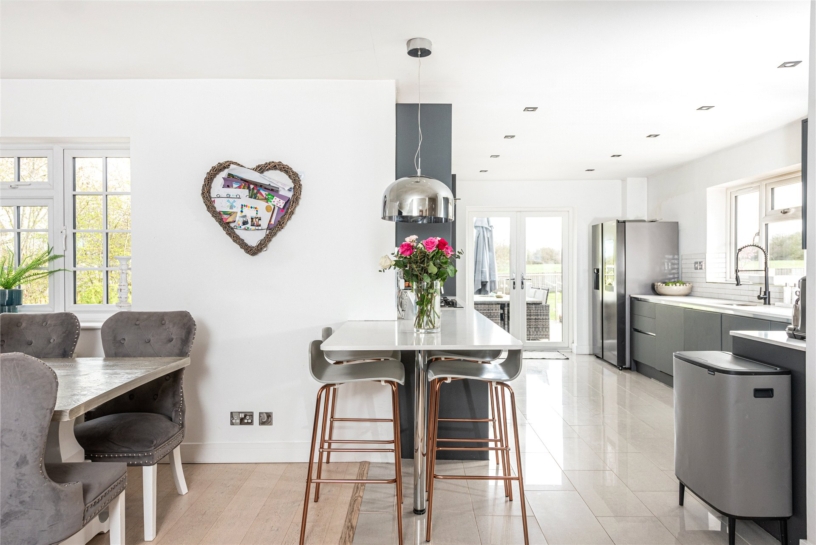 Located in an elevated village position and within the Lugershall Conservation Area, the property has a wraparound garden with front and rear lawns, benefitting from views over open countryside. Electrically operated gates access a driveway with parking for eight cars ahead of the double garage. With nearly 1,880 sq. ft. of contemporary accommodation arranged over two levels – lower ground and ground floors - the extensively improved property has planning permission for further extensions. The split-level accommodation is approached at the front by paved steps leading to the entrance hall which has ceramic tiled flooring, glazed doors to the family room, and another door to a high spec. cloakroom. There are also two store rooms and a utility room on this level. From the hall, stairs lead up to the open plan kitchen/breakfast room and sitting/dining room, and a separate study and office, Further stairs lead down to the three double bedrooms, and a bathroom and a dressing room.