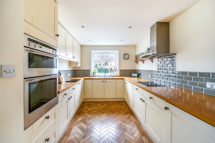 The kitchen/dining/family room is a major feature of the property and is fitted with a range of Shaker style of cream fronted units by John Lewis with hardwood work surfaces. Integrated appliances include an electric double oven, a ceramic hob with extractor, a dishwasher and fridge. The dining/family area has French doors to the rear garden. There is a walk-in pantry and complementary parquet flooring throughout.