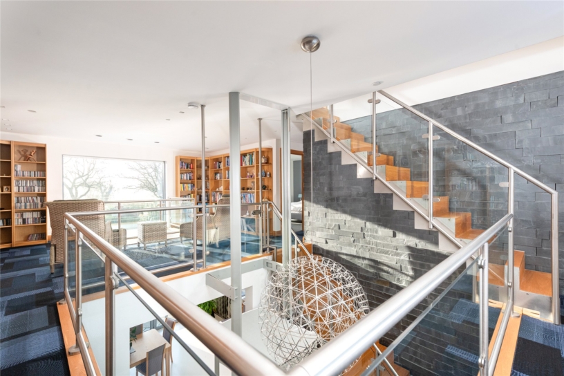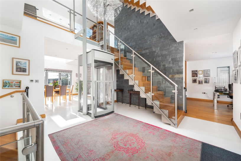 The house is entered via a contemporary style oak entrance door, with glazed side panels, into the hall which has a white resin floor that continues through most of ground floor space, apart from the sitting room, study and games room/bed which have engineered oak flooring.. A staircase with brushed steel hand rails and glazed balustrades with oak treads leads to the first floor galleried library area. In addition, there is lift access to the first floor. A second staircase provides access down to the lower ground floor space. There is a wide opening into the open plan kitchen/dining/family area with a further opening into the study. An inner hallway provides access to the bedroom 5/games room, shower room, utility room and walk-in pantry.