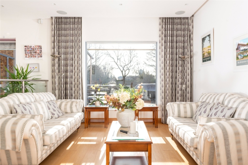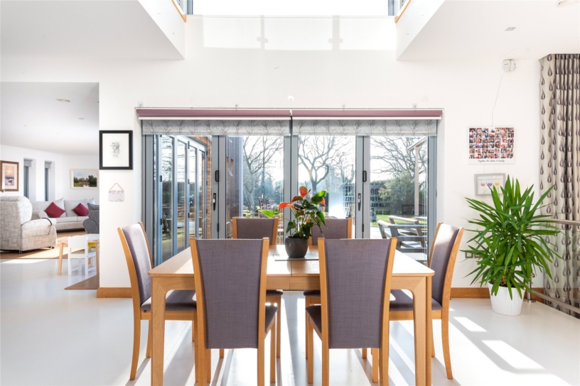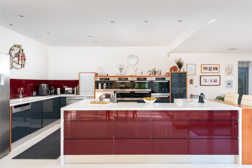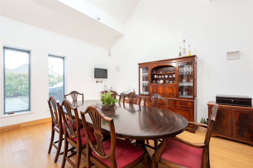 A major feature of the house is the recently extended open plan kitchen/dining/family room, and adjacent sitting room, with views over the landscaped garden to the rear. Two sets of bi-fold doors lead out to the garden and there is a window, with an integrated blind, overlooking the terrace. The kitchen area is equipped in a range of bespoke, high gloss cabinets set in walnut surrounds with Corian work surfaces over. A central island provides additional storage and incorporates a breakfast bar. Integrated Miele appliances include a dishwasher, conventional oven, a steam oven, combination oven and microwave, warming drawers, a coffee machine and a gas and electric induction hob with a retractable extractor set in the work surface. There is space for a fridge/freezer. Adjacent to the kitchen there is space for a seating area and the dining area which has space for a table to seat at least eight.
