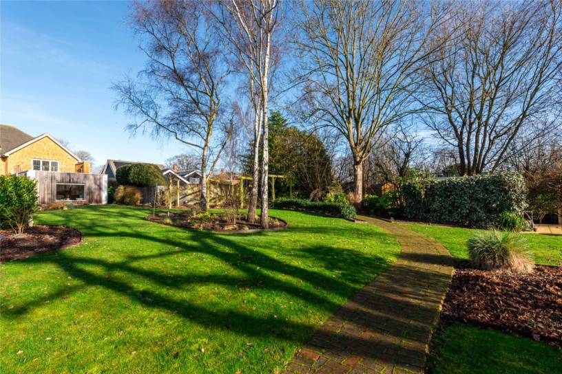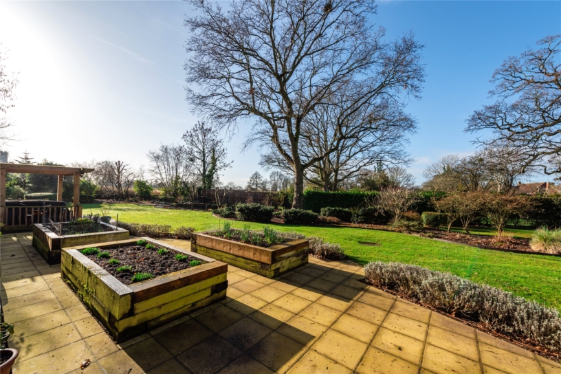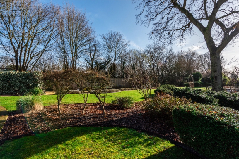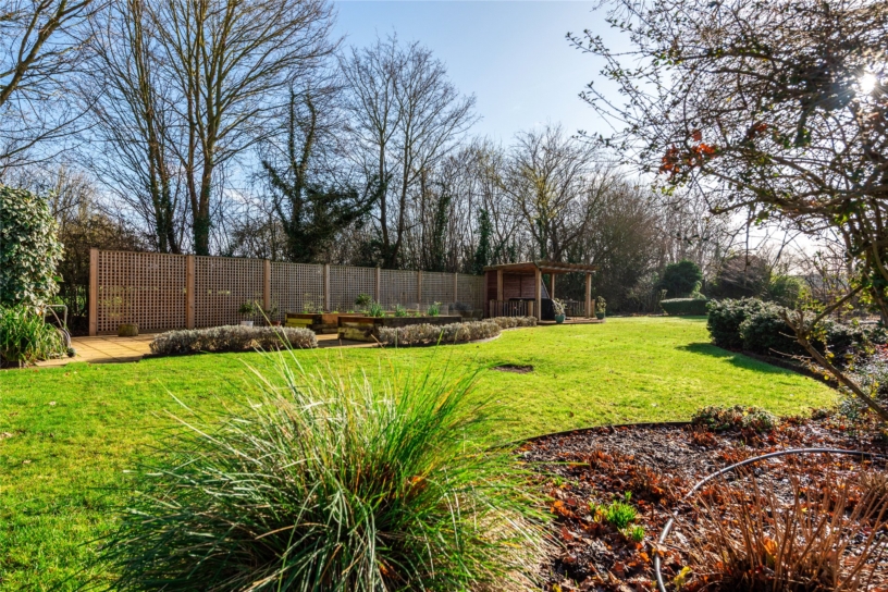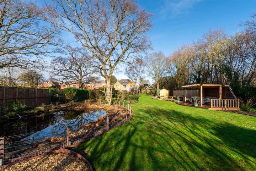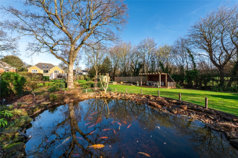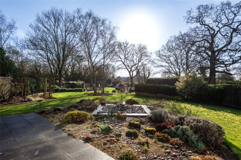 The rear garden has been professionally landscaped with ease of maintenance in mind and has an extensive shaped terrace which incorporates a cobbled water feature. Shaped lawned areas are surrounded by shaped borders and mature trees including Sycamore and Silver Birch. A sweeping pathway continues to a further pond, and there are raised borders towards the bottom of the garden. A covered pergola seating area is positioned to take advantage of the views of the pond. There is also an external water supply. At the far end is a secret garden area with a Japanese theme which includes a broken slate seating area.