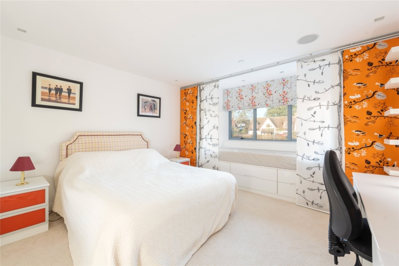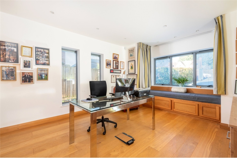 The dual aspect study has a feature bay window incorporating a window seat with storage cupboards under. Extending across the rear wall of the room is a range of built-in storage cupboards providing cloak hanging space, shelving, and media facilities.