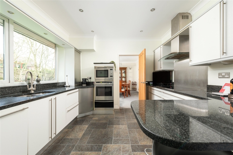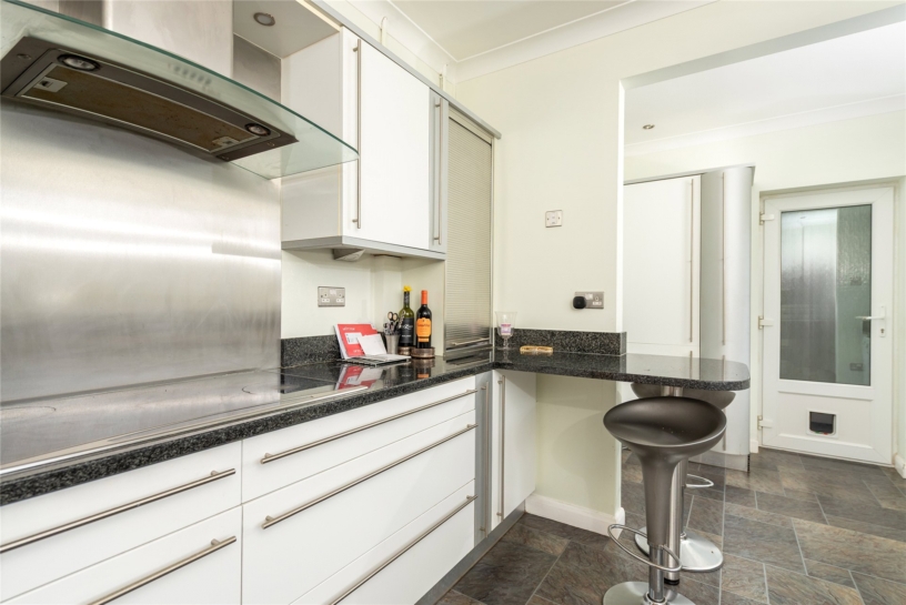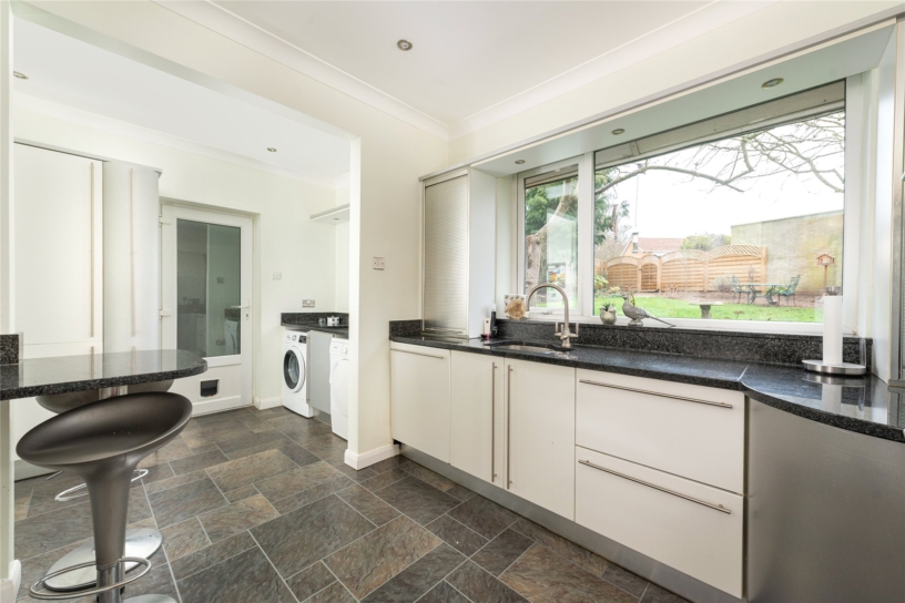 The kitchen/breakfast room has gloss fronted units with granite work surfaces incorporating an inset sink and a breakfast bar. Integrated appliances include an electric double oven, an electric hob with an extractor over and a dishwasher. There is a utility area with matching units, worksurfaces with a sink, and an integrated fridge/freezer. It houses the oil-fired boiler, and there is space and plumbing for appliances. A part glazed door leads to the covered walkway.