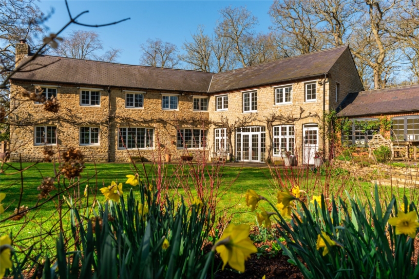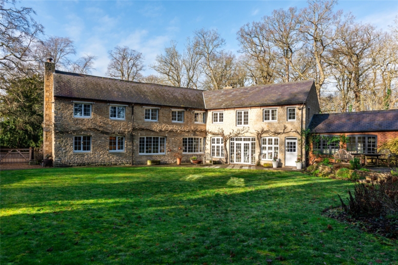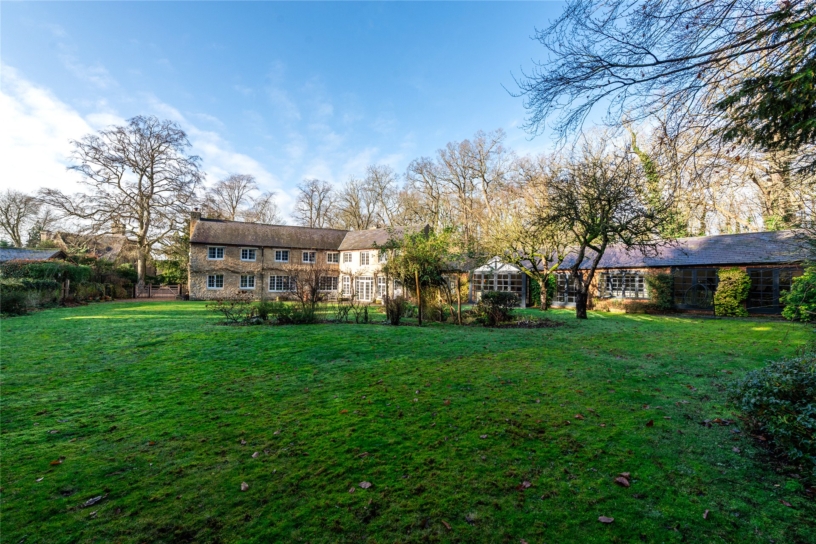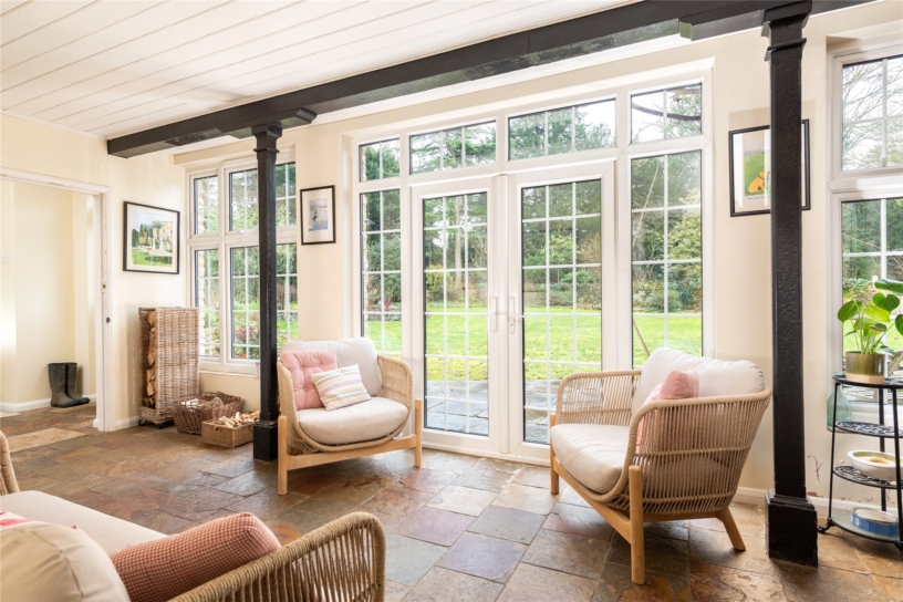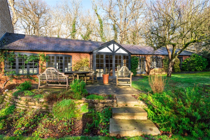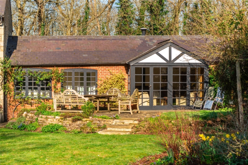 The drawing room has triple aspect windows and a feature mullioned fireplace with an open grate. The garden room provides a versatile additional seating area and is accessed via glazed doors from the kitchen area. It has floor to ceiling iron posts for the exposed timbers, and glazed double doors with wing windows to the formal gardens.
