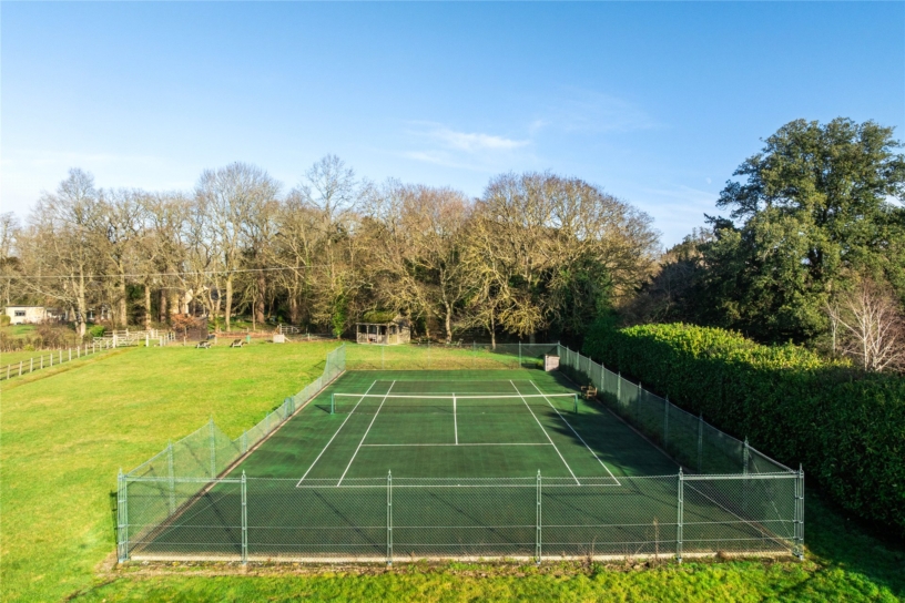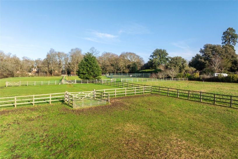 The rest of the plot is mainly paddock land which runs down to the River Great Ouse at the bottom where there is a landing stage. Post and rail fencing divides the land into several separate fields one of which houses a summer house and a hard surface tennis court which is surrounded by chain link fencing. There is also an arena/manège.