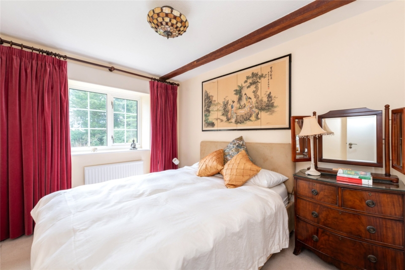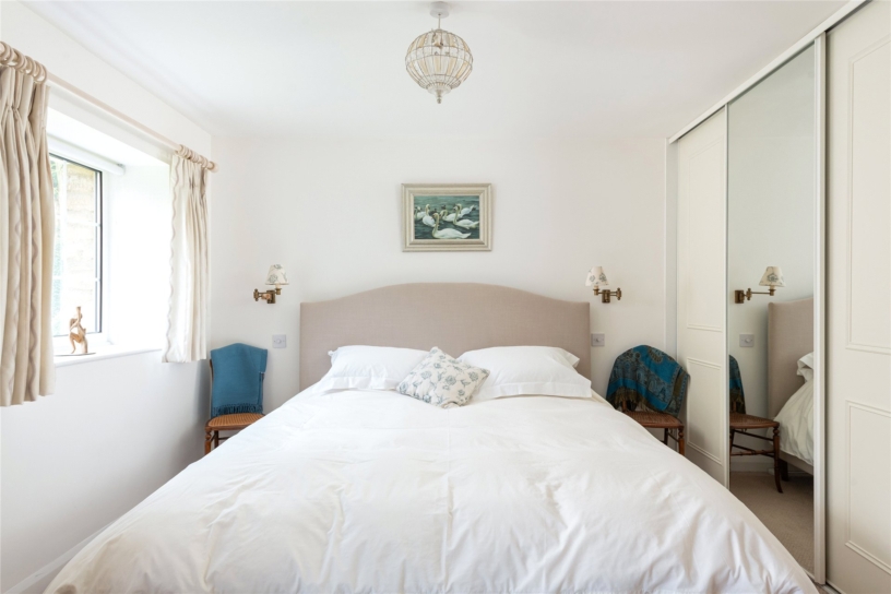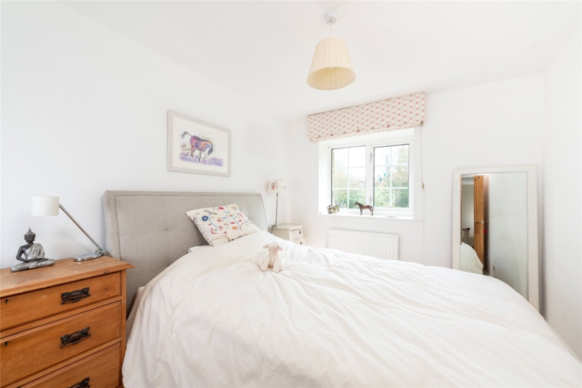 The principal bedroom is accessed via a dressing room which has a comprehensive range of built-in wardrobes. An opening leads to the bedroom which has a further range of built-in wardrobes spanning one wall and three windows with views over the formal garden. The en suite bathroom has dual aspect windows and includes a bath with a shower attachment and a separate shower cubicle.