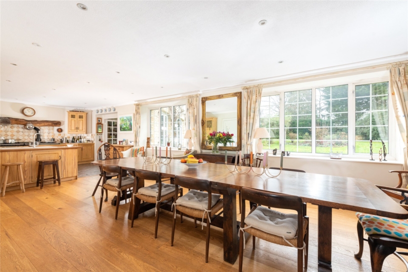 A major feature of the property is the open plan kitchen/breakfast/dining room which measures over 36 ft. by 13 ft. and has two windows overlooking the formal gardens. The dining area has exposed wood flooring and space for a table to seat at least ten.