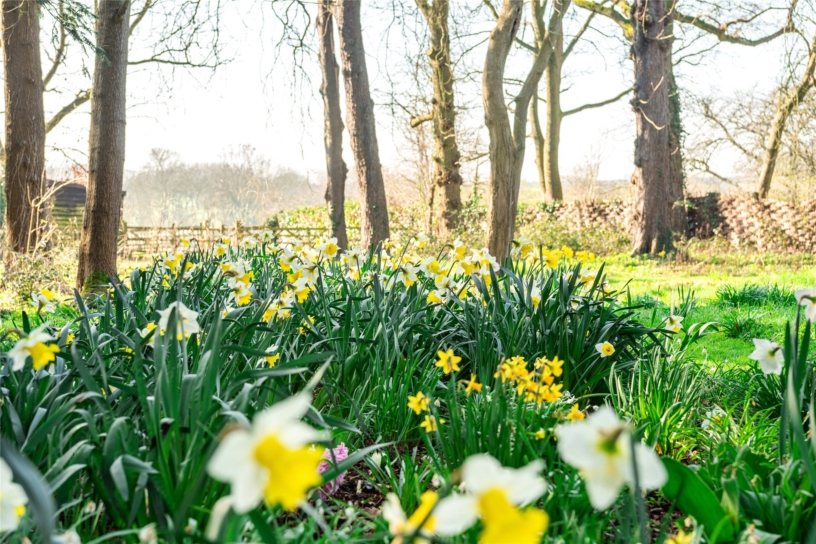 Gaps in the wall lead to a further grassed area behind the outbuilding which has shaped shrubs, mature trees and spring bulbs.
