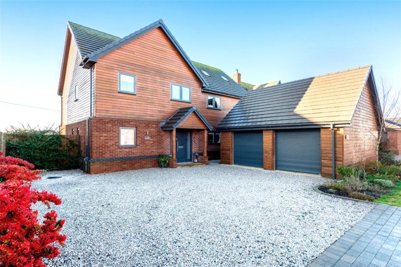 The property is finished to a high specification with an emphasis on energy efficiency and sustainability. The heating is provided by an Air Source heat pump and there is 6.1kw of solar panels with battery storage of up to 12kw. There is approximately 3,300 sq. ft. of versatile accommodation over three floors including four reception rooms, an open plan kitchen/breakfast room, a utility room, and two cloakrooms on the ground floor. The first floor has four double bedrooms, two with en suite facilities and there is a family bathroom. There is the possibility of two further bedrooms on the second floor, with four Velux skylight windows allowing plenty of natural light. This space could also be adapted for a variety of uses. The front has a gravel drive providing parking and access to a double garage with twin electric roller doors, power and light. With the attic space above it could be converted into an annexe subject to planning permission. Services run alongside.